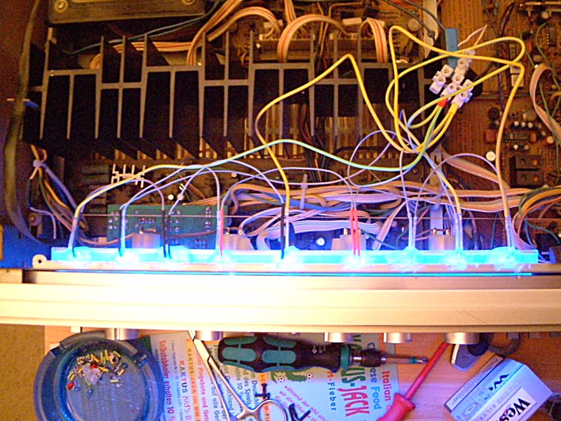Die ursprüngliche Stromversorgung der Beleuchtung (etwa 8VAC Leerlauf) wurde gleichgerichtet und gesiebt über einen gemeinsamen 10Ω-Widerstand an 3x3 2000mcd-LEDs angeschlossen. Das ergibt gemessene 40mA gesamt (laut Datenblatt wären 3x20mA im grünen Bereich).