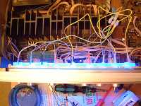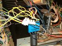 Der Gleichrichter hat zwei Befestigungslöcher, von denen ich das obere für einen Kabelbinder benutzt habe, um die Brücke an den PA-Kühler zu strapsen. Das schwarze Ding zwischen + und - ist ein mit Schrumpfschlauch ummantelter Becher-Elko (30V/1500μF). Der 10Ω-Widerstand sitzt zwischen den linken drei überbelichteten Lüsterklemmen und der rechten einzelnen.